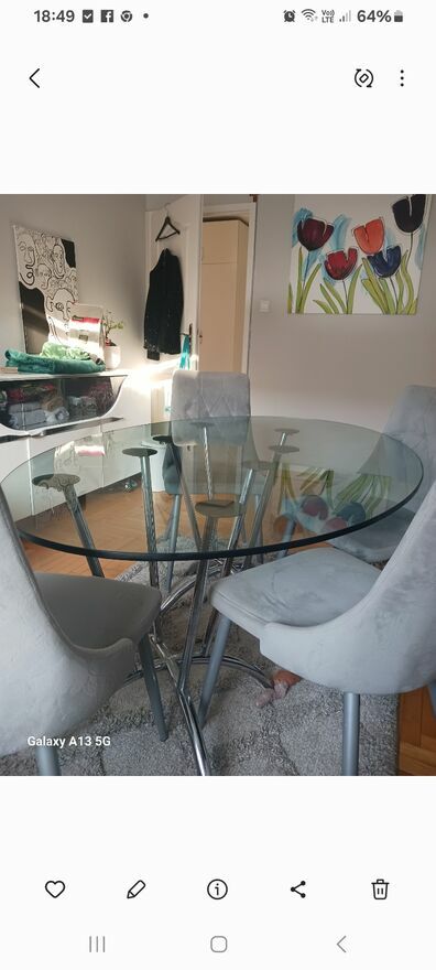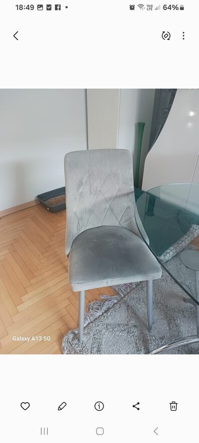 Stół szklany180 cm na srebrnych nogach450 zł oraz 4 nowoczesne krzesła siwe plusz w dobrym stanie 400 zł